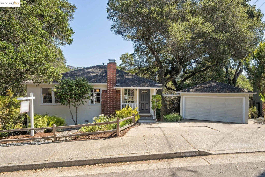 This inviting two-story retreat on a spacious, tree-filled corner lot, feels worlds away yet close to everything. The level-in main floor offers two bedrooms and a full bath, plus an airy living-dining room with a fireplace. The eat-in kitchen provides ample cabinet space and a serene private view—perfect for enjoying morning coffee. The lower level features a private primary suite with a large walk-in closet, laundry room, ample storage, and a comfortable den for relaxation or work. Upgrades include newer AC, furnace, 200-amp electrical panel with EV charger, double-paned windows, and a seismic retrofit. Outdoors, enjoy multiple seating areas, a hot tub, and a fenced yard shaded by graceful oaks, along with a detached two-car garage and a large driveway ideal for projects—all just minutes to Montclair Village and blocks from Redwood Elementary, parks, trails, and freeway access.