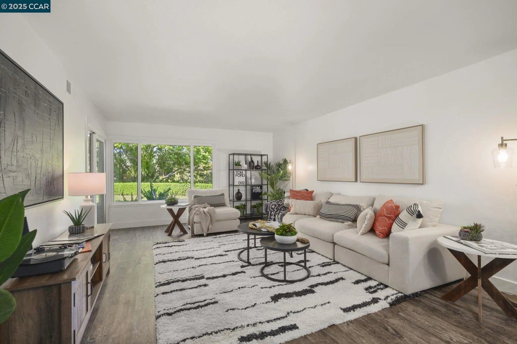 Beautifully renovated, ground level Mariposa model! 1,281 square feet, great room concept overlooking expansive lawns w/ filtered views of the surrounding hillsides. Luxury vinyl plank flooring throughout the property, 5” baseboards & bedrooms feature new carpeting. Spacious secondary bedroom overlooks the private courtyard entry. A full hall bath w/ walk-in shower & new clear glass, black framed shower doors. Laundry room w/ full-sized washer & dryer. King-sized primary suite's walk-through closet & vanity area features new vanity, lighting, 2 spacious wardrobe closets & allows you to enjoy the view from your spacious, level out patio w/ room for flexible furniture options. A tranquil setting to enjoy mornings & evenings outdoors. Great room also exits to patio & features a large picture window for natural light. Entertainment areas open to dining & provide connectivity to the kitchen...fully renovated w/ new cabinetry, pantries w/ pull out shelves, top-of the-line KitchenAid stainless appliances, Caesarstone countertops, recessed lighting & eat-in nook complete the story of your future home. Central heat & A/C. Detached one-car garage!!! Endless possibilities of how to enjoy this home & community, but the time is now to make this one your own!