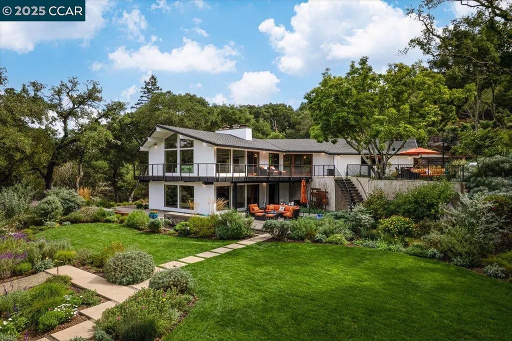 Mid-century modern meets contemporary with this stunning 5 bedroom, 4 bathroom home complete with floor-to-ceiling windows and open floor-plan. The 1.3 acre estate features an oversized-lawn, bocce court, modern fountain, outdoor kitchen, firepit and a mini-Filoli Garden with meandering paths filled with plants that bloom year-round! The remodeled kitchen has cathedral ceilings, a walk-in pantry, large island, Sub-Zero refrigerator and separate full-sized Sub-Zero freezer. Two bedrooms and bathrooms are on the main level (including primary suite), with 3 more bedrooms and a family room downstairs. There's even a separate air-conditioned studio in the yard. The 2-car garage is oversized with several other areas to park on the property at the end of a private cul-de-sac.