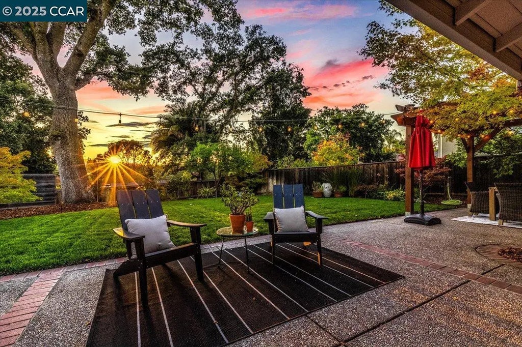 Ideally situated near the top of a court with a view of Mt. Diablo to the West and gorgeous sunsets and ridge view to the East, this home offers the ultimate casual California lifestyle. Perfectly designed for both indoor and outdoor living and entertaining. The updated kitchen with beautiful wood cabinets, quartz countertops, stainless-steel appliances, pantry and a breakfast bar overlooks the great room and leads out to the patio with covered pergola. Cozy up in the spacious living room that features a brick raised hearth gas fireplace insert and a wall-to-wall sliding glass door that allows flow out to the landscaped backyard with persimmon, apple and lemon trees. A coveted Heritage Oak stands tall. An additional huge bonus room, not included in the square footage, makes space for an office, play/crafts room, or artist studio. Adjacent is a huge storage room. Gleaming hardwood floors throughout living room and bedrooms. Dual pane windows. Two-car garage. 12-years of award winning schools are within 1/2 mile. Move-in ready! Make this your forever home.