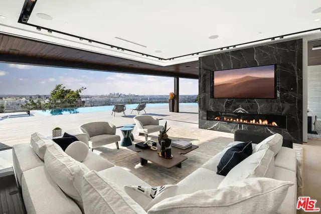 Situated in a prime lower hillside location above the renowned Chateau Marmont, this newly constructed residence offers the epitome of luxury Los Angeles living. Past a double gated motor court, the home's modern steel, stone, and glass facade opens to a truly luxurious interior created by award-winning Nathalie M Designs that is filled with disappearing walls of glass, architectural clean lines, European Oak Wire Brushed floors, 6,399 square feet of deck space, and thoughtful high-end finishes. A functional open layout includes the main living area, grounded by an impressive stone fireplace, and grand dining area, both intended to take in the uninterrupted skyline views. A contemporary dual island kitchen with a secondary dining area sits open to both the main living and dining areas, outfitted with custom two-tone cabinetry, beautiful shadowy stone waterfall surfaces, and seamless top-grade appliances. A designer butler's pantry, guest powder room, secondary ensuite bedroom, and car gallery round out the main level. Sliding glass walls pocket seamlessly from the main living area for uninterrupted access to the outdoor deck and picturesque zero-edge pool with spa, designed with intricate tiles and a relaxing shallow sundeck. Glass railings allow for every opportunity to take in