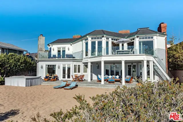 Situated on a rare 80-foot beachfront lot on Malibu's exclusive Broad Beach, this Cape Cod-style estate offers expansive ocean views and seamless indoor-outdoor living. The main residence features six bedrooms plus an office, with soaring 20-foot open-beamed ceilings, abundant natural light from skylights throughout and ocean views from most rooms. The kitchen is the centerpiece of the home, flowing into the family and dining rooms and opens to a large private ocean-view deck. The kitchen is outfitted with granite countertops, Viking appliances, three ovens, two dishwashers, and generous custom cabinetry ideal for entertaining or catering large gatherings. The house boasts two primary suites, one on each level. The main level suite includes a private oceanfront deck with an outdoor fireplace. The grand primary suite offers two custom walk-in closets and two bathrooms, one of which features a spa-like ambiance with a steam shower and a stand-alone soaking tub. Other bedrooms in the main house include an ensuite that opens to a grassy courtyard, a bedroom that opens to the beach and a full ensuite bedroom great for guests or staff. Additional amenities include a private sauna, outdoor spa, and large detached guesthouse with a full kitchen, bedroom, and 1.5 bathrooms perfect for gue