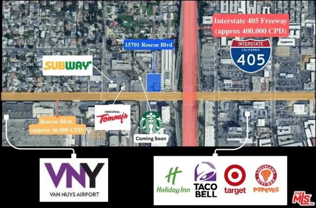 Presenting a rare, fully entitled land site in North Hills, ready for immediate development. The property is fully entitled for a 24-hour gas station and convenience store, 12 fueling pumps with 18 parking stalls, includes a new curb path along Roscoe Boulevard, and is zoned LAC2 for commercial use. Strategically positioned with maximum visibility from the 405 Freeway and supported by grandfathered freeway signage, the site offers unmatched exposure for both local and regional traffic. The location benefits from immediate access to a robust daytime employment center to the south and a large, established residential population to the north, all connected by strong regional accessibility via the 405. Situated at a signalized intersection, the property ensures maximum visibility and ease of ingress and egress for both consumers and tenants. Planned infrastructure upgrades along Roscoe Boulevard and surrounding intersections will further enhance traffic flow and long-term value. With over 264,000 residents and 214,000 daytime workers within a 3-mile radius, the trade area provides a powerful consumer base to support retail, service, and mixed-use concepts. Additionally, exceptional frontage along Roscoe Boulevard, where traffic counts exceed 46,000 cars per day, ensures sustained vis