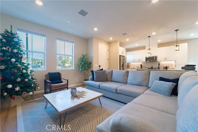 Experience modern living in this beautifully upgraded 2023-built 4-bedroom, 3-bathroom home offering approximately 1,895 sq ft, located within the highly desirable gated Shady Trails community in North Fontana. This thoughtfully designed residence features approximately $80,000 in premium upgrades, delivering exceptional style, comfort, and everyday functionality. The open-concept main level showcases a stunning kitchen featuring quartz countertops, upgraded cabinetry, designer backsplash, farmhouse sink, custom faucet, sleek black hardware, under-cabinet lighting, and a dramatic quartz waterfall-edge center island-perfect for both everyday living and entertaining. Recessed lighting, upgraded interior paint, automatic window shades, and wood flooring throughout further enhance the home's modern and cohesive design. Custom wood and steel stair railings lead to the upper level, where the spacious primary suite offers a beautifully upgraded bathroom with quartz countertops, enhanced tile flooring, black hardware, a tiled shower with upgraded glass enclosure, and mirrored closet doors. The additional bathrooms also feature quartz countertops and upgraded tile flooring, while four upgraded ceiling fans provide added comfort throughout the home. Additional highlights include designer c