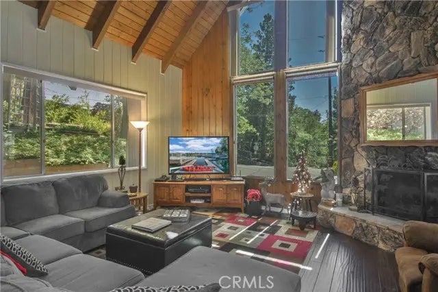 Step into this bright, open-concept living room, featuring vaulted ceilings, a floor to ceiling fireplace, soaring windows framing mountain views that flood the space with natural light, creating an entertainers dream. Featuring 3 bedrooms, 2 bathrooms, with the primary bedroom conveniently located on the main level. The layout is designed for both comfort and entertaining. With a spacious lot and backyard space, a storage shed and spa, fully fenced in backyard and ample parking, it will leave you feeling peace, privacy and serenity in this secluded setting. This charming mountain retreat is located in a sought-after Lake Arrowhead neighborhood. Nestled amidst the trees and close proximity to Tavern Bay Beach Club and Lake Rights, the possibilities are endless. Live where others vacation and experience the best of beautiful Lake Arrowhead. Whether you're looking for a full-time residence, mountain getaway, or an investment property, this perfect mountain escape checks all the boxes.