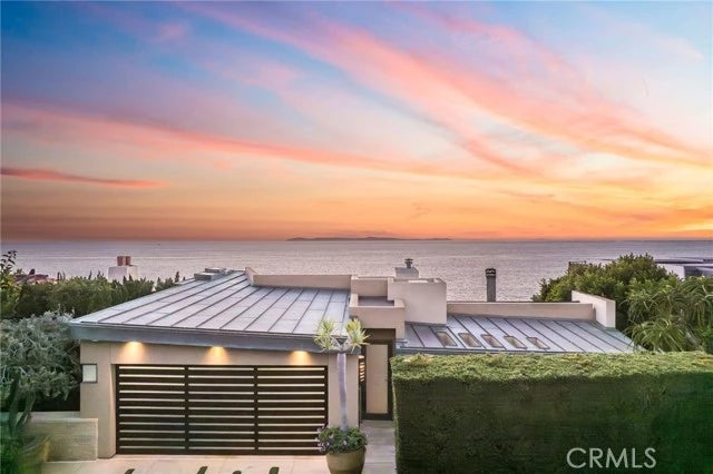 Cima Della Roccia: a Laguna Beach oceanfront Mark Singer A.I.A.-designed residence with expansive ocean, Catalina Island, and sunset views set atop a bluff in Victoria Beach - one of the most desirable enclaves of Southern California. Sited with intention to fully capture the endless Pacific vistas, this contemporary, approximately 5,342 square foot, five-bedroom offering with multiple outdoor spaces is nestled in a quiet part of the neighborhood yet just minutes away from the area’s local restaurants and galleries. Down the floating staircase just beyond the private entryway lies a dramatic double-height great room framed by a wall of windows. Anchored by a standalone fireplace, a sitting area, a large dining section, a discreet wet bar, and the home’s kitchen with super-grade finishes as well as an oversized island create a harmonious entertaining space. Positioned to capture ocean views from every angle, this sun-drenched level extends to the outdoors via a courtyard patio on one end and a spacious terrace on the other. A bedroom currently used as an office completes this floor. The upper level is comprised exclusively of the water-facing owner’s quarters, with the primary ocean-view bedroom, bathroom, balcony, and dual closets occupying its entirety for ultimate privacy