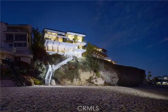 Perched above the sand on Laguna Beach’s most sought-after shoreline, this architectural masterpiece offers 79' of beach frontage with breathtaking panoramic ocean and coastline views. Painstakingly rebuilt by renowned interior design firm Aria Design and architect Anders Lasater, the beachfront residence boasts an unparalleled array of luxurious amenities including private steps descending to Laguna's highly coveted Victoria Beach. Spanning approximately 3,541 square feet across a split-level layout, the residence encompasses three bedrooms (including a tranquil meditation room), two offices, and three-and-one-half baths. At its heart lies a SieMatic kitchen—a chef’s dream outfitted with quartz countertops, and two sets of Gaggenau ovens, Sub-Zero refrigerators, and Miele dishwashers. A custom bar area with Sub-Zero fridge/freezer drawers enhances entertaining, while floor-to-ceiling glass Fleetwood doors showcase mesmerizing ocean views and bathe the home in natural light. Exceptional details include a glass-enclosed refrigerated wine display with storage for 216 bottles and Isokern fireplaces in the living room and primary suite. Approximately 1,200 square feet of outdoor decks and terraces include features such as Infratech ceiling heaters, an outdoor lounge with bar, a