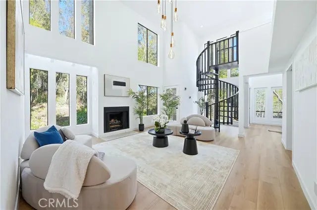 Embrace Brentwood's elevated living in this elegant end unit condo, offering breathtaking treetop and city views from its multiple private balconies. As you step through the front door, dramatic high ceilings crowned by a stunning chandelier greet you, creating a sophisticated ambiance perfect for modern living and entertaining. This freshly remodeled condo has contemporary design, featuring brand new luxury vinyl flooring, freshly painted interiors, and a state-of-the-art chef's kitchen with premium appliances and elegant recessed lighting. This residence is bathed in natural light, which accentuates its open floor plan and refined design. On the main level, there are two expansive primary suites each with a private balcony and ensuite bathroom. A wooden spiral staircase leads up to a spacious loft that overlooks the entire living space. The open-concept layout is flooded with natural light, offering unparalleled privacy with no neighbor to the right side, showcased by views of lush greenery that frame a serene, nature-inspired retreat. Additional features include in unit laundry and two side-by-side parking spaces all within a controlled access, gated community. A prime location only steps from San Vicente's vibrant dining, boutique shopping, and West LA's elite amenities.