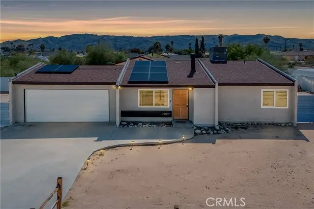 Nestled in a quiet, sunlit neighborhood just minutes from the north entrance of Joshua Tree National Park, this 2-bedroom, 1-bath home presents a seamless blend of modern comfort and relaxed desert charm. As you enter, you'll feel the calm of the neutral color palette, soft natural light, and an open layout that creates a sense of effortless flow. The living and dining areas are connected, making it easy to host or lounge with ease. Vaulted ceilings add roomy height, and updated windows bring in gentle breezes and desert views. The kitchen is well appointed and designed to be both functional and welcoming. Ample cabinetry, updated appliances, and a breakfast nook/open dining spot near the back patio make daily life comfortable and inviting. Each bedroom retains a serene, understated feel while being flexible enough for guest or personal use. The bathroom is clean and bright, with an expanded walk-in shower newly tiled to the ceiling. Outdoor living is effortless - step out to the patio for morning coffee or evening stargazing. The fenced yard invites desert landscaping, creative outdoor setups, or relaxing in privacy. Located close to local shops, easy access routes, and the natural wonders of the high desert, it offers both serenity and convenience; this home is an ideal full-ti