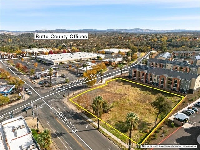 Ground lease or build to suit opportunity on a busy corner parcel. Directly on the corner of Table Mountain & Grand Ave this 0.93 acre parcel offers excellent visibility and potential customer traffic. Located nearby the Butte County Offices, Olive Ranch apartments and The Grove a future 174 unit apartment complex.