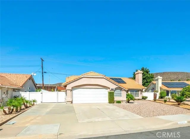 The home you have been waiting for! Gated RV Parking/Boat Parking at this Beautiful and Rare 3 Bedroom 2 Bathroom Home located in the highly desirable 55+ Age Serenade Community conveniently within the heart of Menifee . This home is within a 55+ Community with NO HOA and Low Taxes. Step inside to a light filled home with an open floor plan . The upgraded tile flooring flows throughout the high traffic areas including family room , kitchen , hallways and bathrooms with carpet in the Living Room, Dining Room and all bedrooms. The spacious living room is located at the front of the home with a cozy modern fireplace. The hallway leads to 3 spacious bedrooms . The first bedroom is privately located for guests or a home office. Double doors open to the spacious primary suite with en-suite bathroom offering double vanities, luxurious soaking tub, and walk in shower plus a generous sized walk in closet . Your kitchen features lots of cabinets,pantry , abundant counter space , stainless steel appliances , large dining area , and open to the family room with large windows and views of your tranquil backyard . Enjoy serene outdoor living with easy to maintain front landscape and relaxing backyard with beautiful landscape and fruit trees to enjoy from your Alumnawood Patio stretching the en
