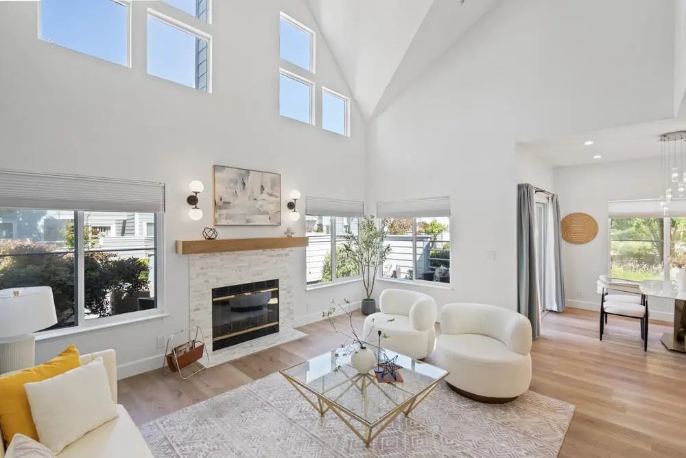 Airy Interiors, Inspired Updates, and a Park-Like Setting in Nantucket Cove. Cathedral ceilings & clerestory windows bring incredible light into the living area anchored by a stacked stone fireplace. Throughout the home dual-direction cellular shades allow you to control light & privacy. The adjacent dining area features a crystal chandelier and its own distinct footprint. A sliding glass door opens to the wraparound patio offering a seamless indoor-outdoor flow. Set among trees and manicured greenbelts, this dedicated outdoor space is perfect for lounging, dining, or simply soaking up the beauty of the setting. The updated kitchen includes ample cabinetry, quartz countertops, pendant lighting, & stainless steel appliances like a Viking range, Samsung Smart fridge. Upstairs, the spacious primary suite opens to a fireplace and leafy views, a generous walk-in closet, and a refreshed ensuite with dual vanity, step-in shower, and soaking tub. The second suite also features treetop outlooks and an updated ensuite. Additional features include in-unit laundry, an attached garage, and access to amenities including a pool, hot tub, gym, & tennis courts. Located near the Bay Trail & Port Royal Park with proximity to top schools, dining, this is Foster City living at its best.