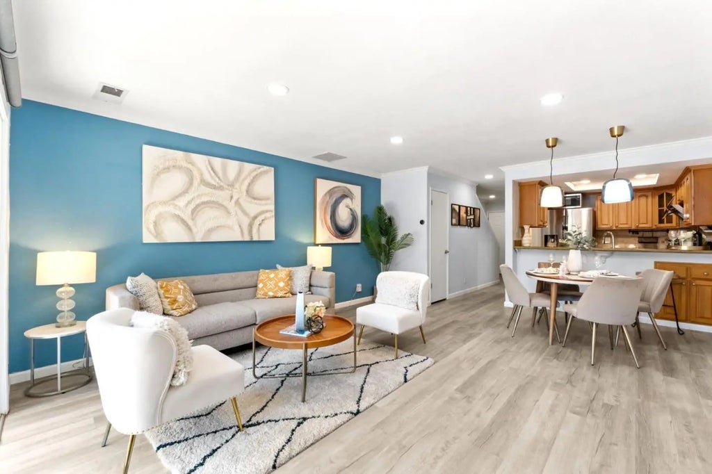 Welcome to this beautifully upgraded 2-bedroom, 1.5-bath townhouse in vibrant Campbell. A rare PUD with a spacious south-facing backyard, this home offers 1,152 sq. ft. of comfortable living space and lives like a single-family home. The kitchen is updated with sleek stainless steel appliances, making cooking a delight, while the open-concept dining and living areas create a warm, inviting atmosphereperfect for entertaining. Enjoy cozy evenings by the fireplace, surrounded by tasteful two-tone paint and accent walls. Both bathrooms have been thoughtfully updated, and the mix of laminate and tile flooring throughout offers style, durability, and low maintenance. Smart-home upgrades include automated curtains, thermostat, and lighting. A washer and dryer are also included for your convenience. Practicality meets comfort with forced-air heating, a 1-car attached garage plus an additional assigned parking space. Tucked quietly off the street, this home provides a private retreat while still being close to Campbells lively shops, dining, and commuter routes.